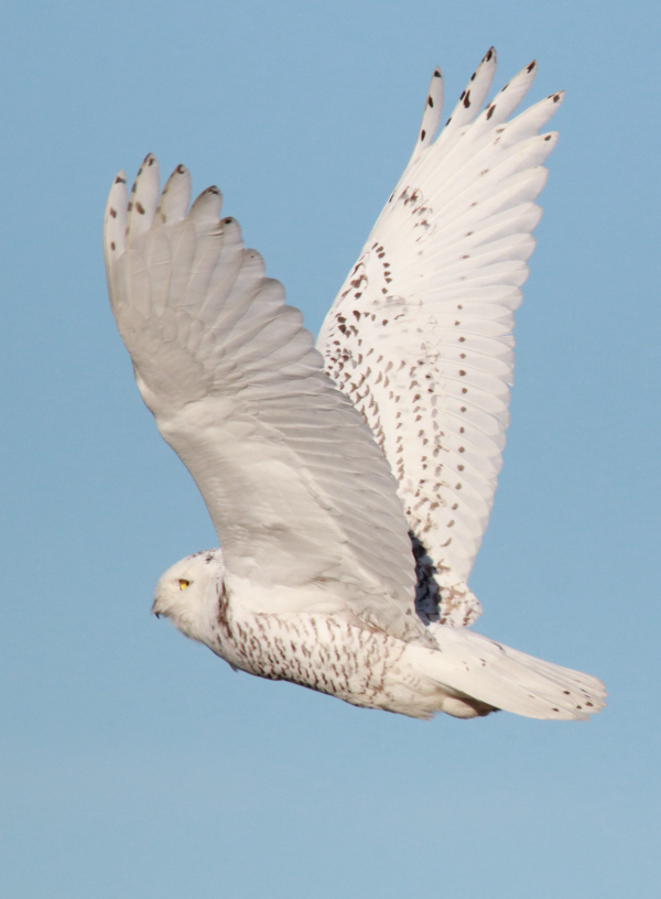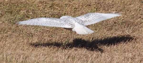 The best of my flight photos, taken after a truck approached and sent it into a repositioning flight, really shows the long wings of a Snowy Owl, a measure of the strong wingbeats that propelled it across the bright northern sky (600mm zoom lens, f-8 aperture, 1/4000 shutter speed, 800 ISO).