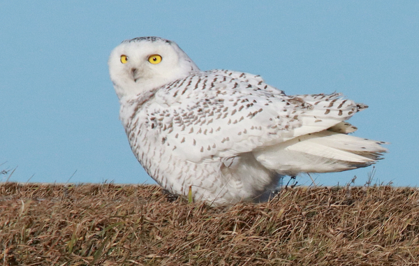 Luckily, instead of gliding over the road, the white owl landed on the grass on the edge of the roadside, which was elevated about 15 feet above my position on the edge of the drying wetland. Having photographed the young owl’s progress as it flew directly away and up the elevated road bank, I also photographed the Snowy as it landed, folding its wings with its eyes alert and opened wide. From my position, the owl was now standing with clear blue sky behind it, offering a completely different setting for me to photograph the owl – and I didn’t even need to move. The owl settled down quickly, and provided similar photo ops with the blue sky background. But at the same time, the owl was now standing next to the road, so I watched for a vehicle on the little-used rural roadway.