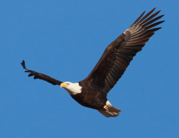 After an initial photo session with the owl, the sight of an adult Bald Eagle approaching overhead made me wonder if it was checking out the owl, or me, but I made the most of the opportunity as it flew into the afternoon sunlight (600mm zoom lens, f-8 aperture, 1/3200 shutter speed, 800 ISO).