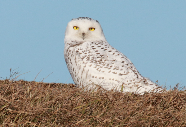 The new position of the owl not only provided a second setting for photographs, but its elevated position with the clear sky background really emphasized how impressive the Snowy Owl was in its late fall surroundings (600mm zoom lens, f-8 aperture, 1/4000 shutter speed, 800 ISO).