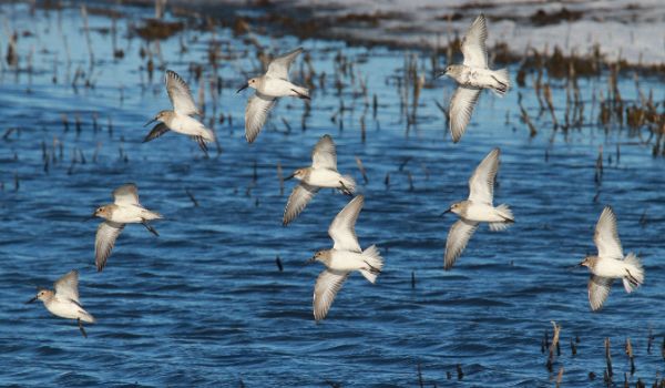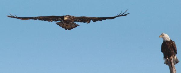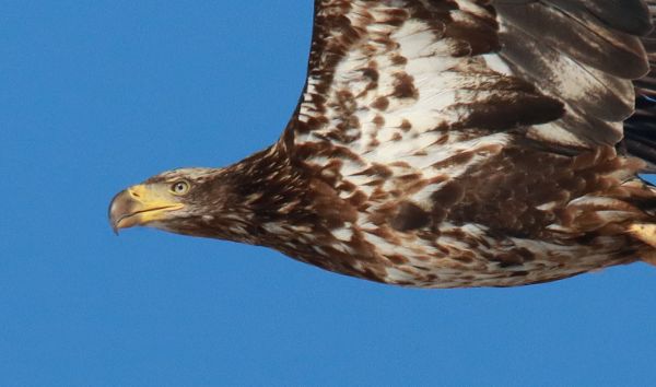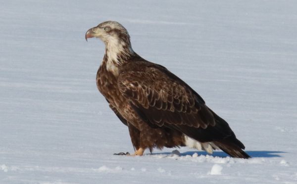 A Bald Eagle Extravaganza – again! Last Wednesday, on the way to Minneapolis-St. Paul, I counted 176 Bald Eagles at the Border Lake, just north of the border between the Dakotas! After checking for Bald Eagles in the Hecla area a week earlier and seeing none, it appeared that after poor weather conditions over the weekend, the first concentration of eagles arrived recently and should continue to build in numbers almost daily. Ice still covered the lake, as did scattered Bald Eagles in groups of up to 9, with lots of action as many eagles were patrolling the ice in low flights or perched in trees along the far side of the lake.