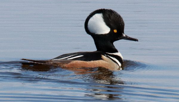 Mergansers are ducks with specialized bills for catching fish, although Hooded Mergansers have a more diverse diet than other ‘mergs’ that includes crayfish (this bird swallowed a leopard frog before being photographed). The “hood” is usually elevated as part of behavioral displays (600mm zoom lens, f-9 aperture, 1/1600 shutter speed, 800 ISO).