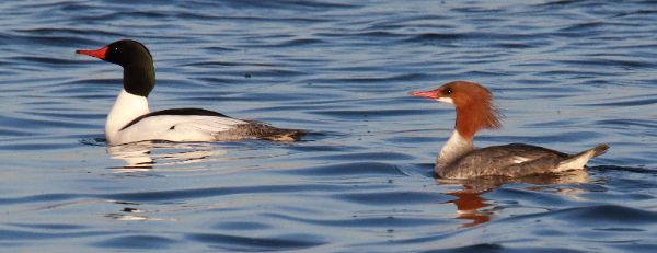 My best photograph of a pair of Common Mergansers was preceded by a couple photos taken as the female closed the gap between her and the male, as illustrated in the photos above (600mm telephoto lens, f-10 aperture, 1/1250 shutter speed, 800 ISO).