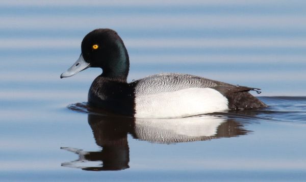 Seemingly as relaxed as the unusually patterned water, a male Lesser Scaup was one among flocks of hundreds that migrated into local marshes and lakes during recent days (600mm zoom lens, f-11 aperture, 1/1250 shutter speed, 800 ISO).