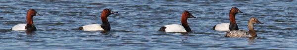 Among the many ducks that were conducting mating displays, Canvasbacks have been the most obvious. This photo shows 4 of the 6 drakes that were courting the hen (600mm zoom lens, f-14 aperture, 1/1000 shutter speed, 800 ISO).