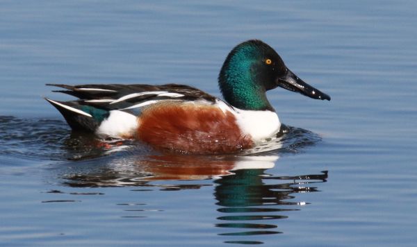 The varied conditions and colors of the water where ducks like this Northern Shoveler were found added much to the quality of the photographs (600mm zoom lens, f-9 aperture, 1/2000 shutter speed, 800 ISO).
