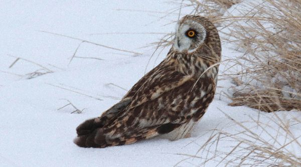 Unfortunately, there was a tall ragweed plant obstructing my view, so I took a quick photo just to show how close it landed before trying to back up a few feet with my fingers crossed. The owl appeared to be more concerned about the other owls, or at least one of them; it was standing behind a couple bunches of grass as it watched the owl in flight. I took a couple photos of the owl before it repositioned a few feet by hopping over the snow to stand behind a bigger bunch of grass. That's when the owl of concern approached on the wing, which flushed the first owl and the 2 flew southwest, possibly in a chase mode.