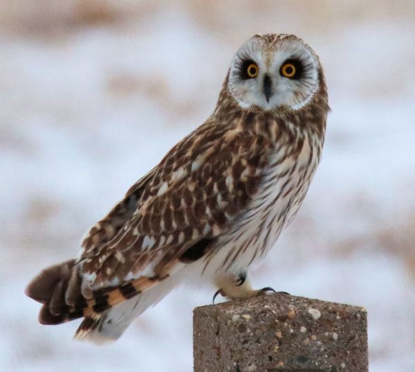 The previous afternoon, after publishing last week's issue of The Birding Wire late Tuesday, I drove 8 miles south before making a U-turn to return home. After not seeing a bird the entire drive, before me there was a Short-eared Owl flying near the road β no, there were 3 owls! I literally drove by the spot only a few minutes earlier; so once again, it emphases how "timing is everything," especially related to birds and birding. Two of the owls seemed to be interacting up the hill from me, but I was closest to the first Short-eared Owl, so stopped and watched to see what the owl would do next. That's when I was really surprised, because the owl not only flew in my direction, it actually landed next to my car, about 25 feet away on a swatch of newly fallen snow.