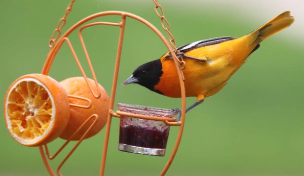 For orioles, 3 things will bring you colorful visits daily – grape jelly, sliced oranges, and fresh water. We have found that for the most part, orange halves attract orioles to a feeding station, but grape jelly keeps them coming back. There is an impressive variety of interesting oriole feeders available on the market, most with some level of orange color to add to their attraction to orioles and to provide perches for the colorful birds. Primarily, oriole feeders have 1 or 2 spikes for you to attach orange halves on, along with a bowl to hold grape jelly.