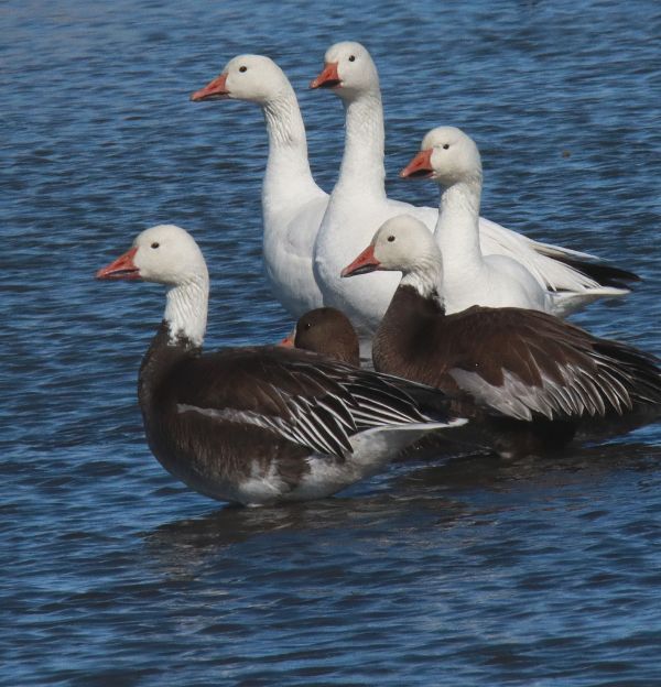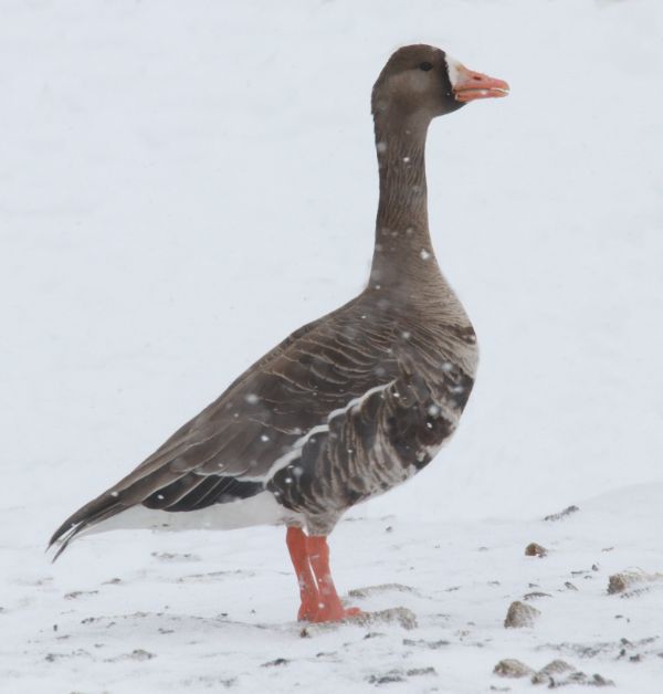 Without knowing what to expect during this initial birding drive in the midst of the 4-day snow event, I was happy to see more avian action than usual for the week β primarily among geese. Tuesday there were very, very few geese in the area and I figured the big migration had passed, but during this break in the weather there were clearly 3 areas where more than ten thousand Snow Geese were flying in miles-long flocks β 4 miles, 6 miles, and 10 miles long! There were undoubtedly many, many Ross's Geese mixed within the Snow Geese, and there were hundreds of White-fronted Geese on hand too β maybe more than 1,000 at a marsh mixed with as many as 2,500 Snows and Ross's Geese.