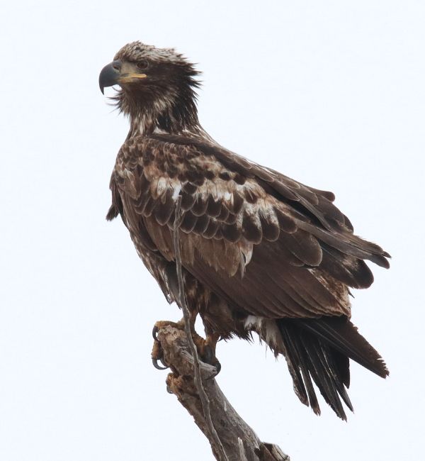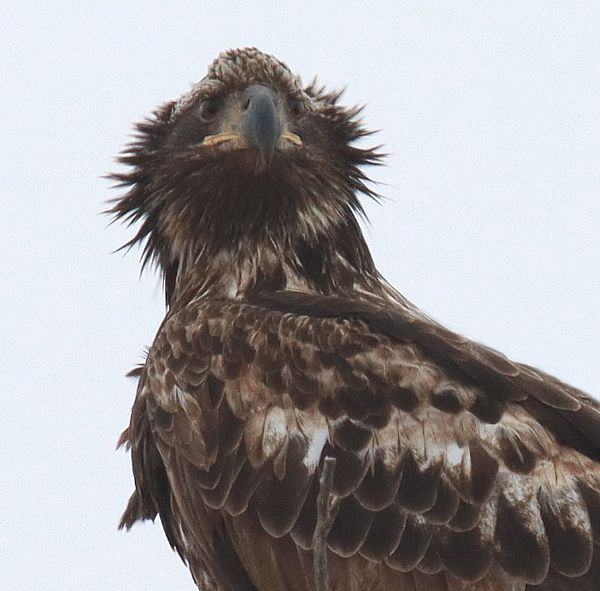 While the abundance of geese on the move was another unexpected surprise, so were the 14 Bald Eagles assembled in an old grove of trees surrounded by seasonal meltwater shallows where a concentration of migrating flocks ducks had assembled β Northern Pintails, Northern Shovelers, Green-winged Teal, and scattered Mallards. Although it was exceptionally overcast, I had to try to take a few photos of some of the eagles, and one young eagle in particular caught my attention as its nape feathers formed something of a crown, such as I can't recall ever seeing before. Also, sprinkled among the many ducks were 23 Tundra Swans in sub-groups of 2 or 3 β all these birds in a location where I've never seen a bird before.