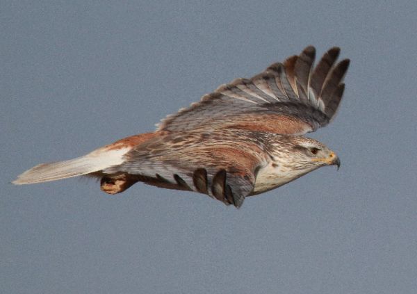 Most of the flocks were made up of Snow Geese, but there are obviously more Ross's Geese in "white flocks" now; the Ross's were fairly obvious by sight and especially obvious when checking my photographs. The flocks of Cackling Geese have been gone for about 10 days, as have Canada Geese that don't nest here β only the Giant race of Canada Geese remains. It is also interesting to note that there are many flocks of Canvasbacks in the area, but no Redheads over the weekend. Sunday there was a Ferruginous Hawk standing on a low hill west of the nest, the male I think. There were also 2 Red-tailed Hawks present almost 2 miles south of the Ferrug nest β 1 might have been the Krider's dude.