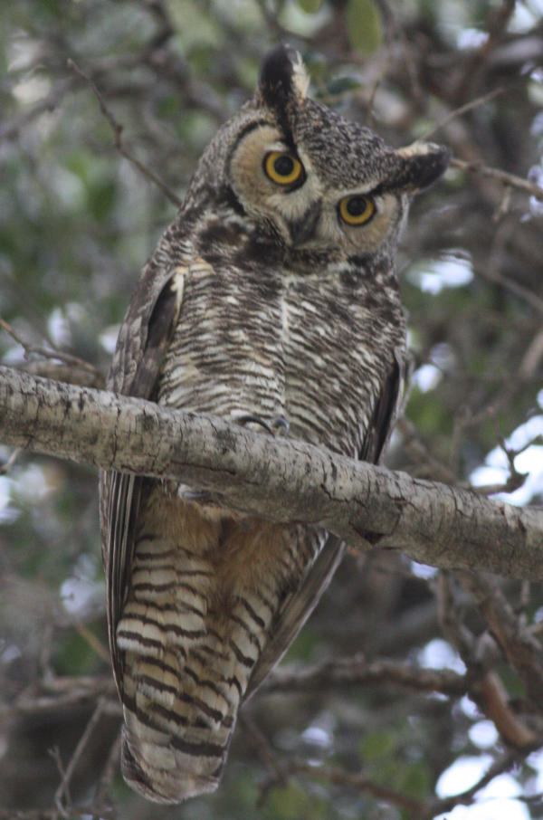 These owls are impressive avian predators, and Great Horned Owls’ specialized owl adaptations include: 1) acute hearing that utilizes binocular hearing in which the two ear openings are positioned at different levels on their face, and 2) a facial disc of specialized feathers that focus sound toward the ears; 3) remarkable eyesight that is impressive during daylight hours but most specialized for night activities due to the large eyeballs with large pupils and a high density of rod cells in the retina, allowing them to detect motion in extremely dim light; 4) specialized flight feathers that reduce the sound of these big owls in flight, which is especially helpful when hunting, and 5) their large body size, big broad feet and long talons.