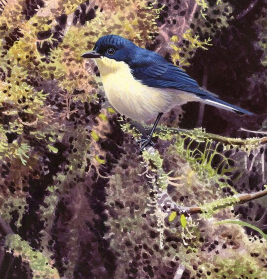 ![]() The Satin Berrypecker was recently discovered in cloud forest habitat in western New Guinea (illustration by Suzabolcs Kokay). ![]() A close-up of the Satin Berrypecker shows the yellow coloration on the white underside (photo by Borja Mila).