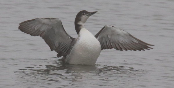 The foggy conditions were far from adequate for photography beyond documentary images though, and even when I increased my usual ISO setting from 800 to 1600 and reduced my aperture from f-8 to f-6, the photos I was taking had no color at all. They were a medium-gray at best, resembling black-and-white photos that had zero contrast as the water reflected the foggy gray sky, and the winter plumage of the loons showed no black coloration. The only white was on the underside of the loons, from the neck to the belly, and the only time I saw a belly was when the female faced directly toward me as she rose up to produce classic wing flapping motions that gave me a real thrill as I followed the wingbeats in fractions of a second through my camera lens.