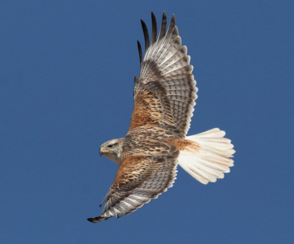 Moments later, the male flew a short distance to land on a low hill to the east as though it was after ground-based prey. That led me to reposition a bit to take full advantage of the morning sunlight. In a couple minutes I was rewarded with an opportunity to photograph the male as it made a dramatic banking flight into the brisk west wind. I needed to quickly step outside my car to take what became my favorite series of flight photos of the year of the regal hawk in flight with a deep blue sky background (see the last photograph illustrating this article).