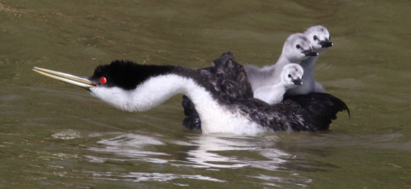 An ultimate action photo that shows an adult Western Grebe displaying aggressively toward a passing grebe as the trio of downy hatchlings balances on its back during the sudden action (600mm zoom lens, f-13 aperture, 1/1000 shutter speed, 800 ISO).