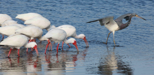 An active Tricolored Heron hunts before an advancing flock of White Ibis as they forage through the shallows with perfect morning sunlight illuminating the birds and the blue sky that is reflected on the surface of the water (400mm telephoto lens, f-8 aperture, 1/1000 shutter speed, 400 ISO).
