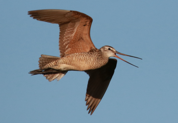 While showing the double action of calling while in flight, this Marbled Godwit photo exhibits a lot of character as it is highlighted by rich afternoon sunlight against a clear blue sky (600mm zoom lens, f-7 aperture, 1/2500 shutter speed, 400 ISO).