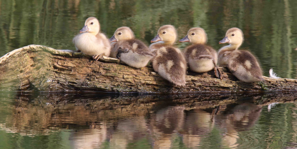Downy ducklings are especially cute as their innocence is reflected in their faces during an afternoon resting session. The sharp image and dark background provides contrast that even highlights individual down filaments and details of their eyes and bill. Also note the feather on the right side of the log (600mm zoom lens, f-10 aperture, 1/2000 shutter speed, 400 ISO).