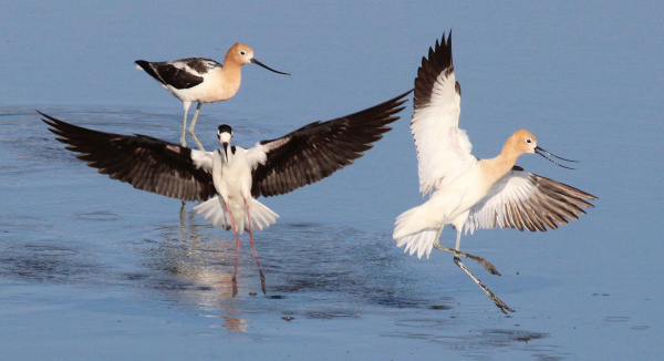 Brilliant afternoon sunlight provides a reflection on the wings and beak of the leading American Avocet, intent on driving a Black-necked Stilt out of its territory. All birds were kept in focus by using the broader f-9 aperture setting, and all action was stopped sharp with a 1/2500 shutter speed. The positions of the birds in the photo frame is the result of timing, anticipation, and a lot of luck (400mm telephoto lens, f-9 aperture, 1/2500 shutter speed, 800 ISO).