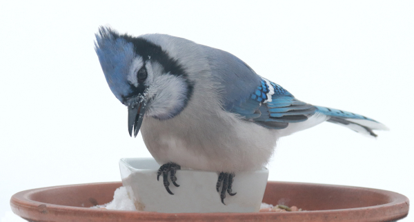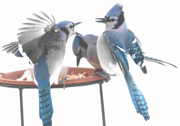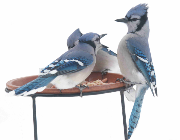 An excellent example of why we always need to be alert for the next opportunity to take action photos, the arrival of second and third Blue Jays at the smallish platform feeder provided the chance to take a quick series action photos (330mm zoom lens, f-6 aperture, 1/640 shutter speed, 800 ISO).
