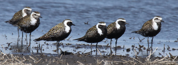 The chance to find American Golden Plovers during a migration stop in the center of the continent provided an especially rare chance to photograph some groups. Individuals in the flock of 20 showed a variety of molt patterns, varying from fully molted to partly molted goldens (May photo; 600mm zoom lens, f-10 aperture, 1/1600 shutter speed, 800 ISO).