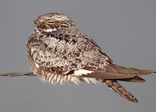 The beautifully textured colors of a Common Nighthawk stood out as it balanced on its unusual perch of barbed wire. Looking relaxed with its plumage fluffed a bit, the moody color reflecting from the marsh added a pleasing background that accents the nightbird (August photo; 600mm zoom lens, f-6 aperture, 1/2000 shutter speed, 800 ISO).