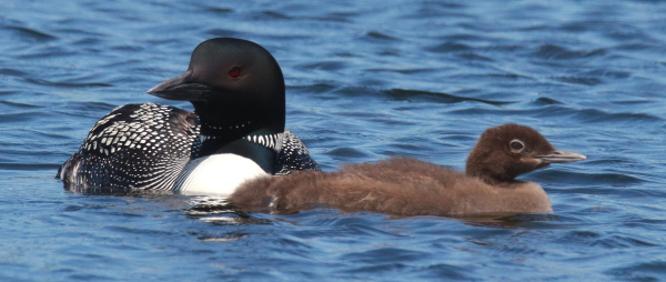 The mid-afternoon sunlight provided perfect highlights in the plumage of this adult and 2-week-old downy Common Loon on a tranquil Minnesota lake. Summer loons have a special attraction for me as they provide exceptional photo ops that have been shared among friends (July photo; 600mm zoom lens, f-10 aperture, 1/1250 shutter speed, 800 ISO).