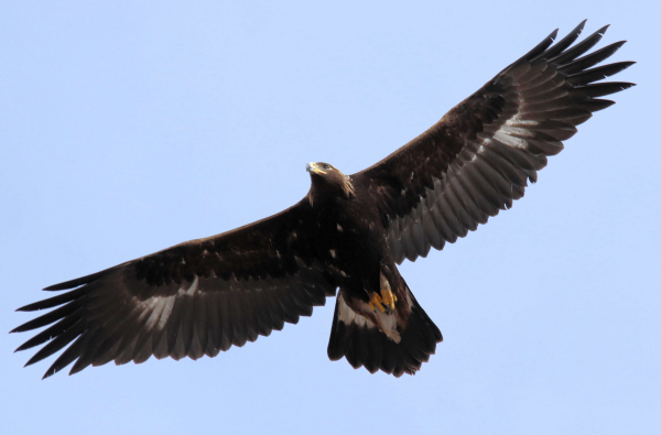 How Lucky can ya be? As 2 Golden Eagles soared toward me, even above me – close – gliding on remarkably long wings above the peak of a tall prairie butte, I followed their flights through my camera lens. How Exciting! But I stayed in the moment in spite of my heart racing as I pointed my camera at one young eagle, then the other as they approached, turned, and approached again with one extended its gliding flight until it was straight above me, close! (February photo; 600mm zoom lens, f-8 aperture, 1/3200 shutter speed, 800 ISO.)