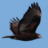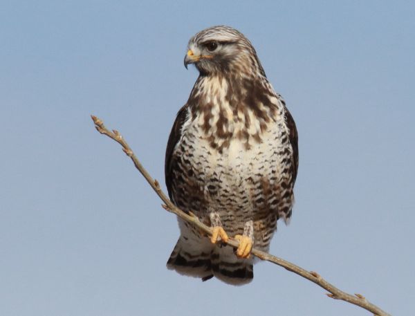 After returning from another exciting winter raptor survey in the Pierre area, I didn’t know what to expect during a balmy 50-degree sunny afternoon birding drive in my home turf, but expected hawks and owls would be a possibility. I pointed my car south, where I know the landscape pretty intimately – every tree grove, marsh, prairie hill, and all the rest of the features for a half-mile beyond the roads. At the 2-mile point I noticed a “dark object” on a stump nearer the opposite side a frozen lake that I figured I better check with binoculars. It was a bird, and in a flash I could see it was a male Rough-legged Hawk, and the really exciting thing about this hawk was that it flew in my direction after finishing its meal, and even stopped to perched at the top of a young cottonwood tree not far from the road – marvelous!