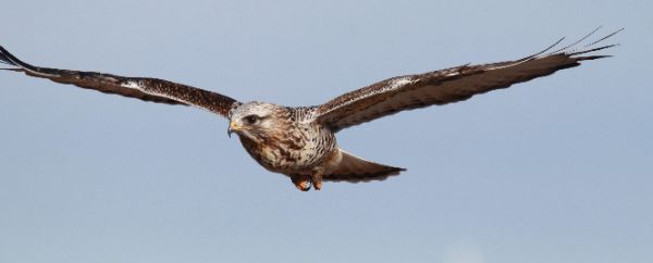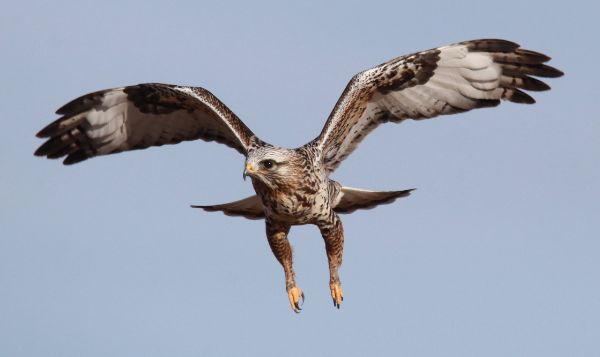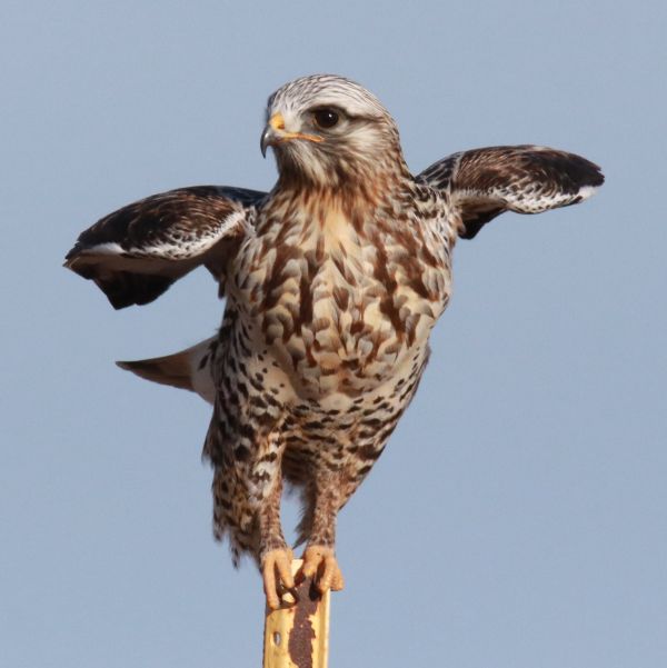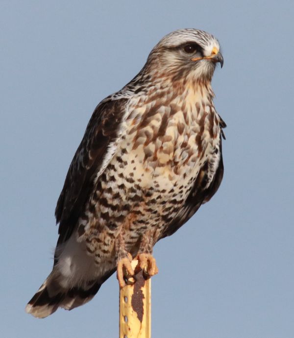 That’s also when I began to realize this appeared to be a second male Rough-legged Hawk. I recalled that during the initial photo session the hawk’s dark markings on its neck and upper breast weren’t symmetrical; but this bird had perfectly symmetrical markings, and it seemed to have a more colorful breast with lighter-colored gray back plumage. The initial hint was that this hawk seemed smaller, but this bird was every bit as trusting and accommodating as the first for this eager birder.