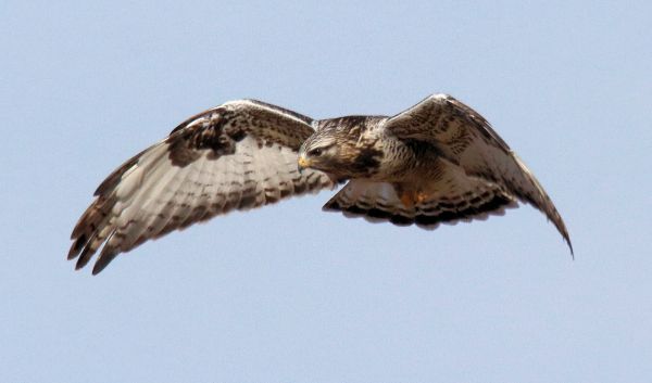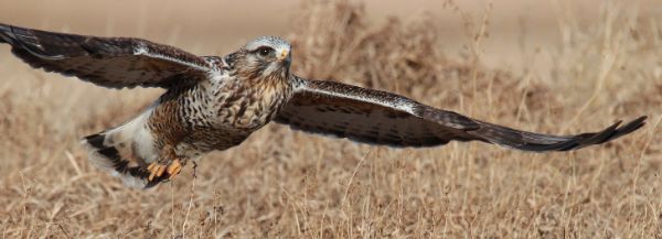 This was my kind of bird, and I took full advantage of the chance to photograph it in clear view as it settled in and began searching the area for movement in the grass below. While I took some pleasing images of the hawk at ease, I was also poised for the Rough-leg’s next move. In time, it bent forward and leaped into flight again, only to turn broadside before me as I snapped a couple quick exit photos – one of which turned out to be pretty impressive. Almost immediately the hawk went into strike mode and glided, then alighted on the opposite side of the road – very close!