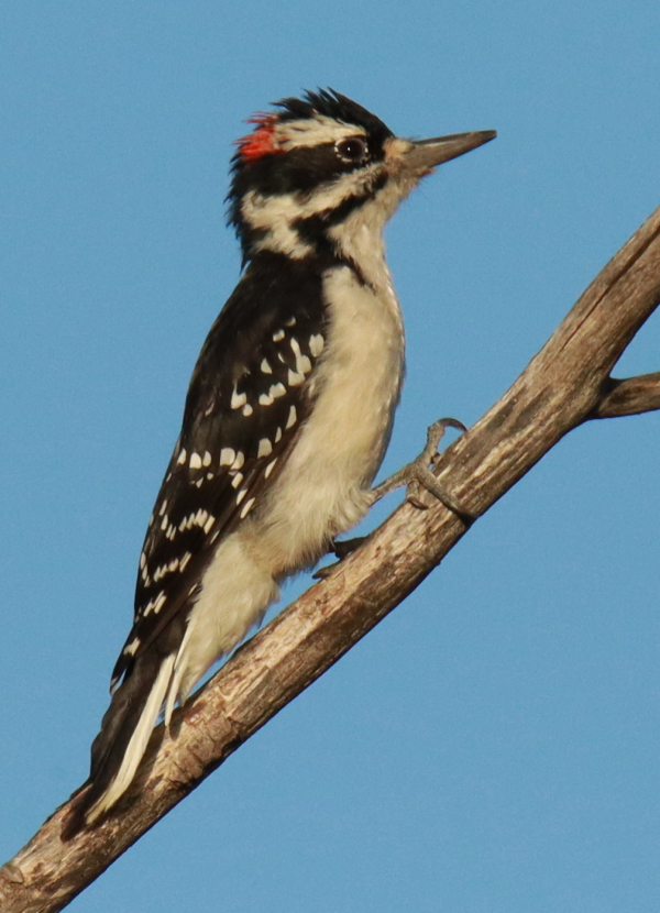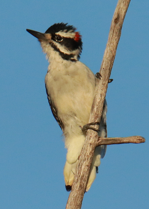 During the first drive, in addition to the kestrels I encountered 8 Red-tailed Hawks, 4 Swainson’s Hawks, 3 Northern Harriers, an American Bittern, 2 Blue Jays, a standout flock of about 15 Western Meadowlarks in addition to scattered meadowlarks along the way; and a flock of 10 Wilson’s Snipe that popped up from a nearby marsh a couple times as I waited for a Belted Kingfisher to return to a favored perch was another interesting sighting. There was also a flock of about 40 Killdeer resting at Charo Marsh, and a scattering of Mourning Doves along the way. A male Hairy Woodpecker turned out to be the best photo subject Thursday – active at the skeleton tree no less, and during primetime sunlight too: 6pm in my area now.