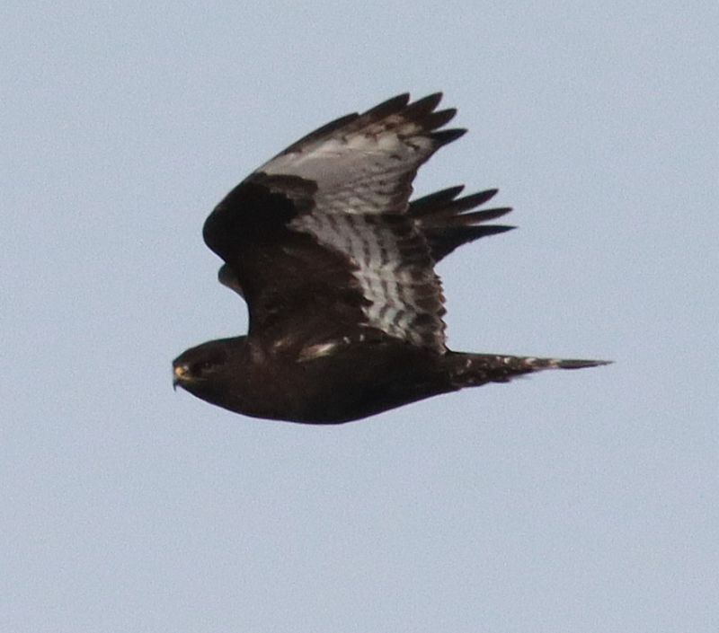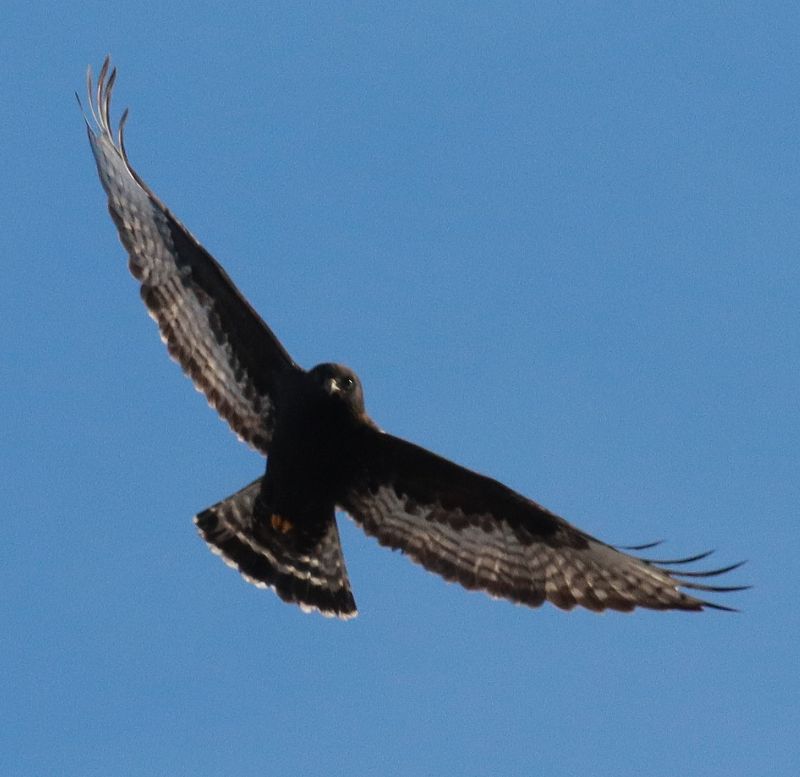 Eventually, the black hawk flew in my direction and I was able to take a few long-range documentary photos of it on the wing. It soared over the open grassland to the south, then turned back to the north, providing a couple more long-range photos and continuing north. As it turned out, I was able to parallel the black hawk's flight for more than a mile before it circled low over a frozen marsh, and that's where a second Rough-leg took flight to begin soaring in tandem with the black hawk. Was this a black morph hawk too? My long-range photos suggest it was another black one! How rare is that – 2 black Rough-legs soaring in tandem! And then they began gliding north from the apex of their soaring circles at long range, and out of sight.