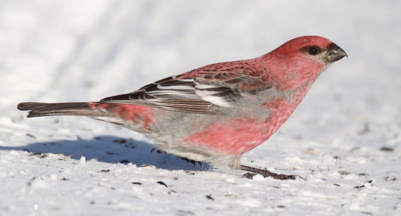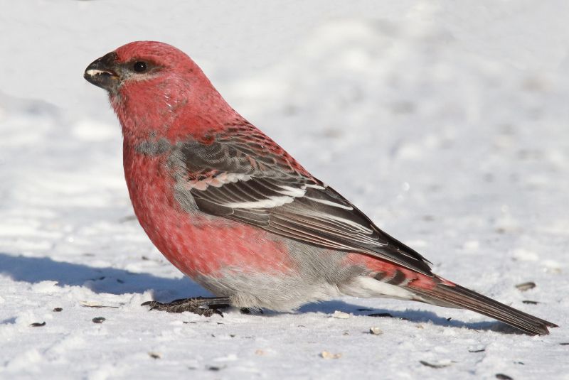 There was not a second for remorse though as a flock of 5 Pine Grosbeaks flew into sight and perched in an even closer ash tree. As I focused my camera on a male, 3 females dropped down to the road to search for seeds and grit – right next to my position! Even as I took my first photos of the females, 6 more Pine Grosbeaks arrived, and they were joined by a tight flock of about 20 Evening Grosbeaks – WoW – all positioning in photo range! I zeroed in on a close male Pine Grosbeak with stunning red-pink plumage as about 20 grosbeaks were active on the newly fallen snow beside the road. I couldn't have orchestrated this initial photo opportunity better!