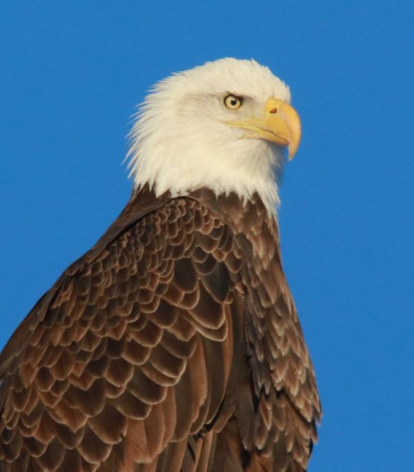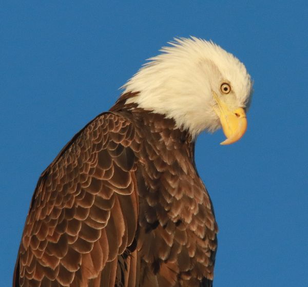 Perched 4 power poles down the road, a third adult Bald Eagle may have been waiting its turn to eat, but maybe it would provide a photo op in the meantime. I drove past the eagle to get on the sunny side of its position with incident, then parked a moment to let on-coming cars go by. Seeing the eagle appeared unaffected by my car and passing trucks, I hoped it would hold its position as I approached and stopped. It worked, and it was quite amazing to be in perfect position with regard to sunlight to photograph the big Bald as it viewed the area, but only looked my way once. Not wanting to impact it if possible, I drove away after about 40 seconds and 15 photos to leave the eagle as I found it – the best way to interact with birds.