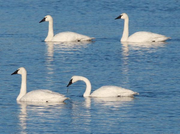 There is something about swans and snow – perhaps it's the pristine white on white effect – and when you add a beautiful shade of sky blue reflecting on the surface of tranquil water, it creates a very serene visual that takes you to a quiet place of meditation as you absorb the beauty of a captivating slice of nature. I let my body relax so my eyes could take the lead in absorbing the scene before me – aah. There were many pairs, single swans, 2 family groups, and larger loose groups that overall numbered about 70 beautiful Trumpeter Swans, swimming, feeding, bathing, preening, resting, and sleeping swans on the adjacent snow-covered ice, in what seemed to be something of a sense of community among the huge white waterfowl.
