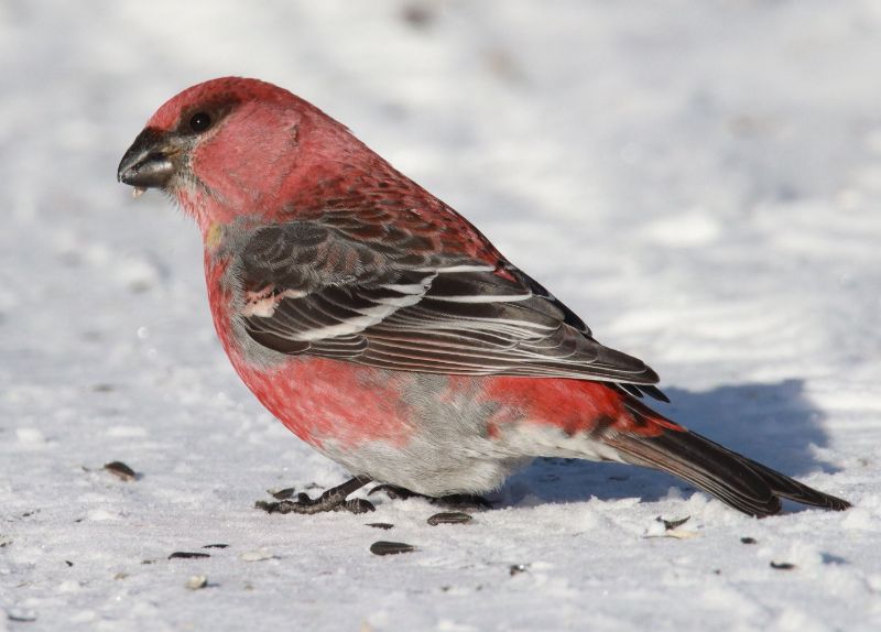The attraction of winter finches can do 2 things for birders at this time of year: 1) Make your feeding station irresistible, and 2) Go where the winter finches are! As for selecting foods at your feeders to attract wintering finches large and small, it's easy – provide shelled black oil sunflower seeds. Even the smallest finches like Pine Siskins and Redpolls can eat these shelled seeds that provide the best-quality of food for them. Larger finches relish this dish too, and by using shelled seeds, you eliminate the mess (and cost) of shells. If you wish, you can provide smaller nyjer thistle seeds too, which will serve to reduce competition if nothing else.