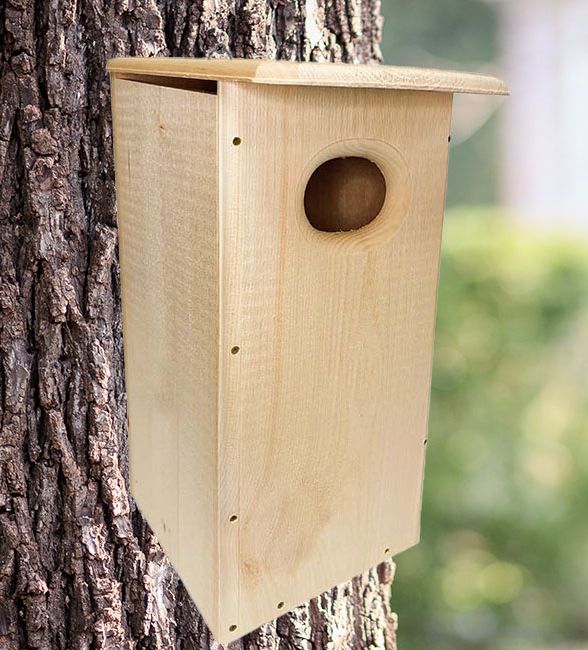 This sturdy nest box is constructed with ¾-inch thick pine that provides added insulation using a safe, natural material. The oval entrance hole that measures 3 inches tall by 4 inches wide is positioned near the top of the deep box to discourage predators. Very important is the side panel that opens in 2 latched sections – the top for nest checks and the bottom for seasonal cleaning. The slanted roof fully covers the top to protect the interior from rain, open slots in the base drain any liquids that get inside, and ventilation slots beneath the roof provide fresh air.