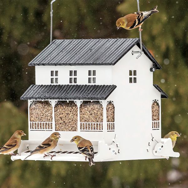 The White Farmhouse Squirrel-Resistant Feeder measures 11½ x 12 x 12 inches, is protected by white all-metal siding, and provides 2 mounting options. This attractive feeder features spring-loaded perches to keep out larger birds and has a "no-waste seed saver baffle" that prevents birds from dropping seeds to the ground. To learn more about the White Farmhouse Squirrel-Resistant Feeder see Duncraft White Farmhouse Bird Feeder | Squirrel-Resistant | Hopper