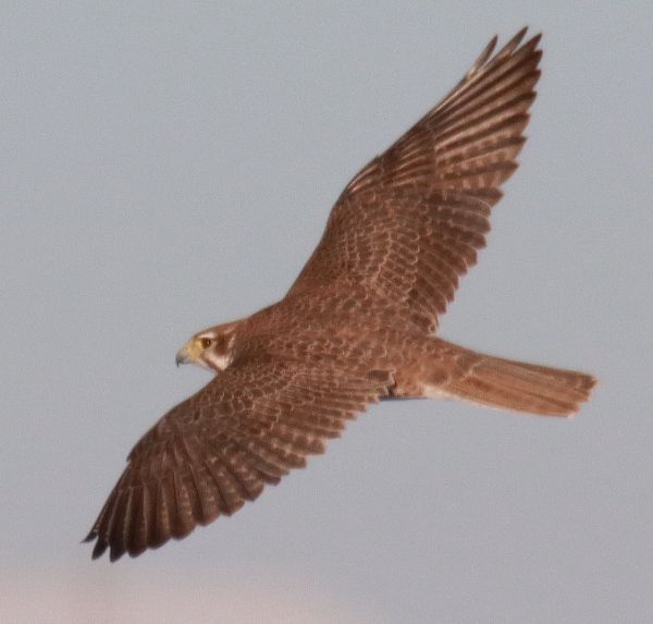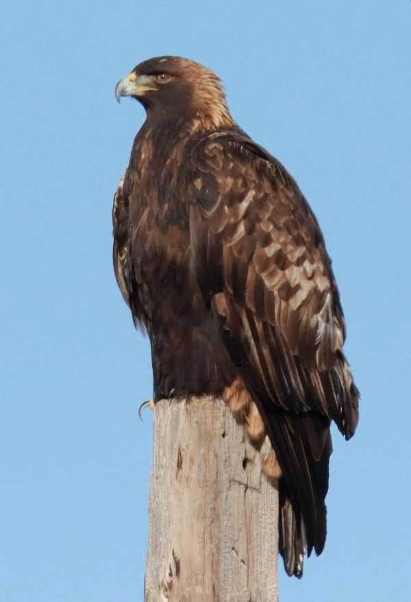 This survey was conducted last Friday, January 30th, so it's always interesting to compare it to earlier surveys. Forty days before on December 20th I found quite a different mix of raptors, which was pretty typical for December, when Bald Eagles and Red-tailed Hawks dominate the raptor population. That count included 14 Bald Eagles and just 1 Golden Eagle, 17 Red-tailed Hawks but just 6 Rough-legged Hawks; there were no Prairie Falcons, but there was a Merlin and I found 3 individual Ferruginous Hawks and 3 Northern Harriers. The differences between this winter's 2 surveys shows a typical seasonal change in species numbers, progressing from early winter to mid-winter. The previous winter, very similar numbers of each species were observed except that Rough-legs were half as prevalent during that January 29th survey.