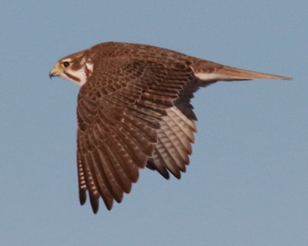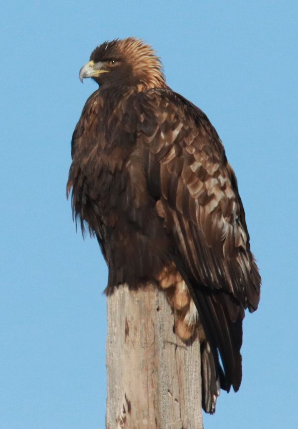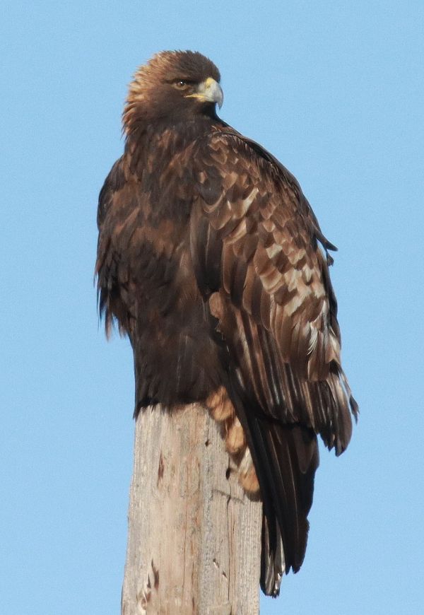 After the clouds cleared to provide ample sunlight, I was able to photograph a number of raptors, with standouts being the male Rough-legged Hawk, a pretty female Rough-leg, and an adult Golden Eagle – all perched – along with a female Prairie Falcon in flight and a few documentary photos of other raptors. Some images are shared with you here. In spite of the cloudy weather to begin with, it was really a full afternoon of birding thrills as I drove along the survey route. And with each bird I get to photograph, my excitement level soars – what a fun boost of happiness the survey route provides!