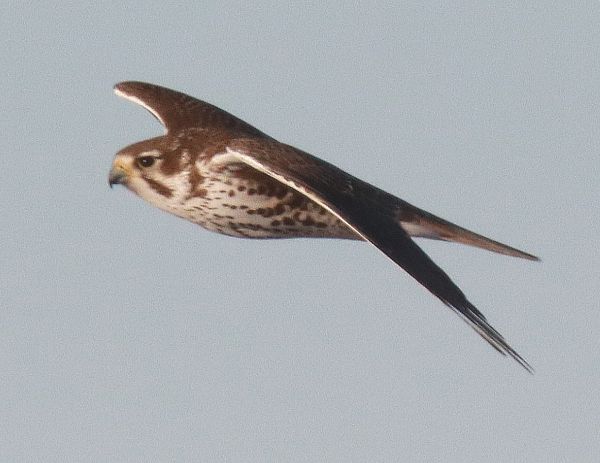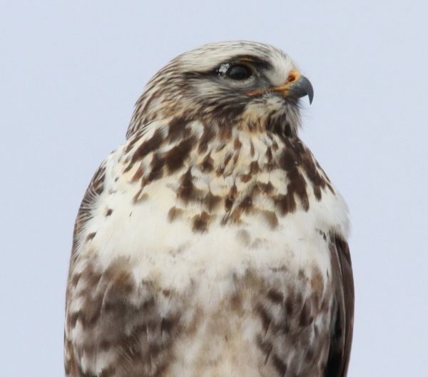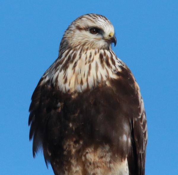 The first breakthrough was finding 2 Bald Eagles along the Missouri River just beyond the capitol city – a small adult male and a large female first-year Bald Eagle. As I entered the Fort Pierre National Grasslands I found a gem of a dark morph Rough-legged Hawk and a high-flying Golden Eagle – things were looking up, literally as I observed the Golden soaring on high. East along the county line road, I sighted a Northern Harrier hunting just above the prairie, and a Rough-legged Hawk perched in a tree along the road was a big plus, as were the 7 Greater Prairie Chickens that flushed nearby.