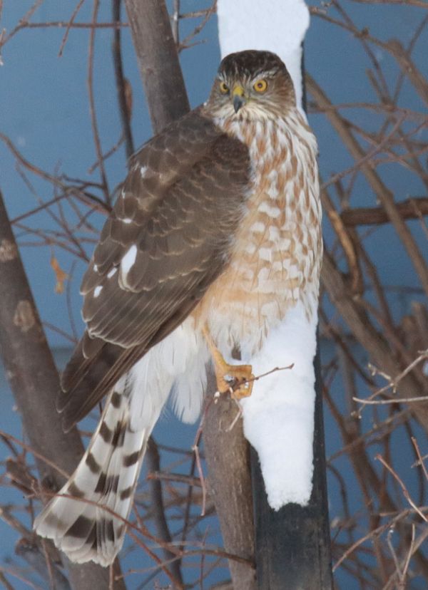 Speaking of the blizzard, last Wednesday the female Hairy Woodpecker returned to the elm tree adjacent to my feeding station, but in her personally unusual way the female Hairy only foraged on the elm tree, twice, ignoring the suet, seeds, and shelled peanut halves in the feeders – hmm. Sunday I realized I didn't see any Red-breasted Nuthatches, and that may have been the case Saturday, and it continues – have they left the area? The White-breasted dudes continue to visit. I only saw House Finches visit my seed feeder Saturday and Tuesday this week, after it seemed as though they left the area last week. And the excitement of then there was the first-year Sharp-shinned Hawk sighted beyond my front door, then outside my bay windows Sunday afternoon, so I'm on alert to see if it stays in the neighborhood a while. In the meantime, enjoy the birds around you, wherever you are and wherever you go.