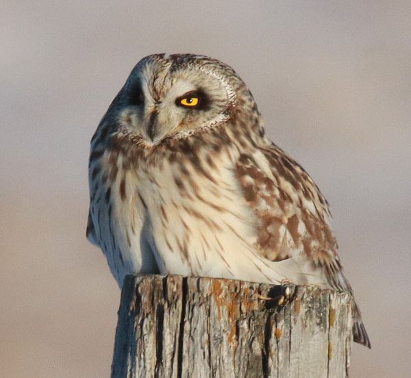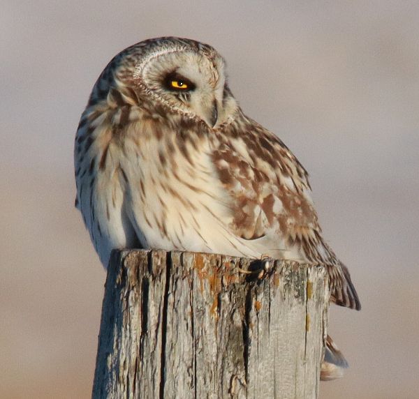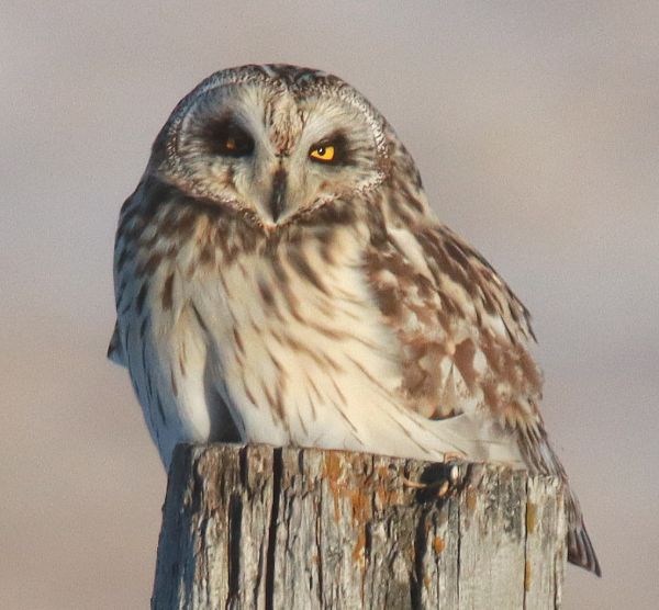 While driving south I only saw 2 Horned Larks before turning back, but turned onto the side road to venture east of my friend Herb's ranch. As I neared my usual turnaround spot I saw a bird on the wing – a Short-eared Owl on the hunt – what a nice surprise. With the sunlight right at mid-afternoon, I followed the owl's active flights until it perched a distance away. I waited, patiently at first, then impatiently; but the owl finally took flight and I followed its moments through my camera lens until I realized it was going to land on a stout post right in front of me – beautiful. I took some photos as the owl settled in, fluffing its plumage to the full extent and making a lower profile on the post to keep as warm as possible in the 4 degree sunshine. Although stationary now, the owl was still on the hunt, watching every direction from its new perch. After some time I decided it didn't look like the owl would take flight again, so I backed up a hundred yards or so to keep from scaring the bird before turning around to drive back to the office; but what a great opportunity, and what an impressive bird.