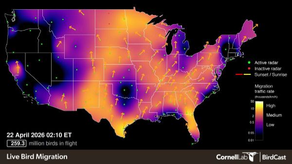 Take a look at BirdCast's 4 primary migration webpages: Live Migration Map - BirdCast and Local Migration Dashboard, which are remarkable resources for every birder to use; as are the migration forecasting sites, Bird Migration Forecast Maps - BirdCast and Local Migration Alerts. You can check in anytime for live information, or to check back on past migration maps or information.