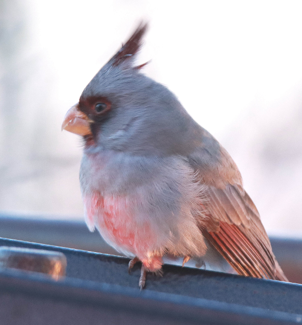 Personally, I’ve only seen a few Pyrrhuloxias – in Arizona near Tucson in Sonoran desert habitat with saguaros and other cacti, in open grasslands in southern New Mexico, and near the southern tip of Texas in the Rio Grande Valley on the edge of scrub woodlands. But in the snowy open landscape of North Dakota in December? It was a first for me and other birders who drove to the site 30 miles east of Bismarck, some to add a new life bird and all to add a new state bird to their lists, and many like me had a special opportunity to photograph the Dakota Pyrrhuloxia. Melinda embraced everyone’s arrival, even had a couple chairs set up near her feeders – and every visitor was delighted with the quick and easy opportunity to witness the newest visitor to the state.