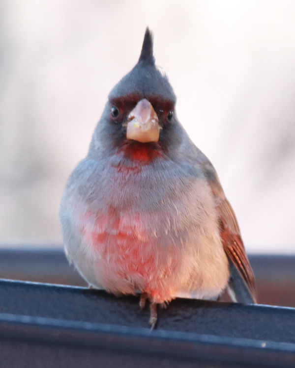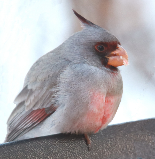 That’s when Corey and Bill arrived from Bismarck; Corey had indirectly provided the information about the “first of state stakeout Pyrrhuloxia” on eBird, and as quickly as I deemed possible, I joined the guys and Melinda at the chairs (I stood for a better view). It was fun to share the experience with them all, and Pete joined us 10 minutes later, arriving from Bismarck too.