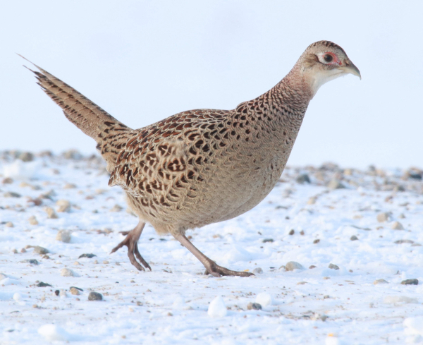 Although I was parked relatively close to take photographs, the young Golden wasn’t obviously concerned – until a loud semitruck hauling grain passed by. A moment later the impressively large and dramatically colored eagle leaned forward, raised its wings and sprang into flight – what a bird! That meant I was able to find both of the eagle species native to the United States. I also observed 2 flocks of 6 Ring-necked Pheasants, along with a lone female that was foraging on widely scattered corn kernels on a gravel road, which kept her in shallower snow than the surrounding countryside. This pretty pheasant provided some nice photos as she foraged ever-closer as I watched her progress just before a giant cloud bank reclaimed the sky.